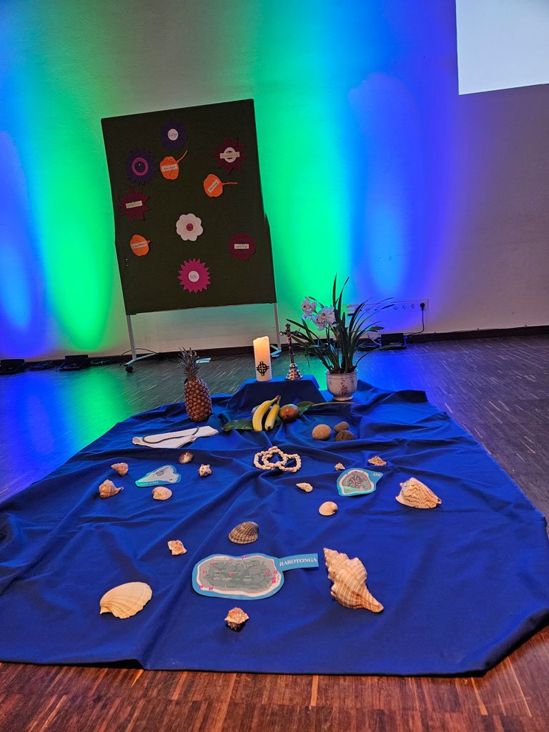 Die Dekoration verbreitete pazifische Atmosphäre. Auf einem großen blauen Tuch wurden Inseln von Muscheln umrahmt. Eine kleine Auswahl der auf den Inseln wachsenden Früchte war ausgelegt und Steine deuteten die am Meeresboden vorhandenen Manganknollen an.