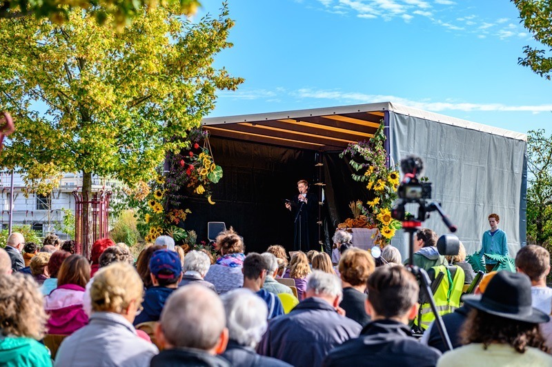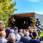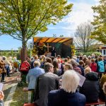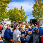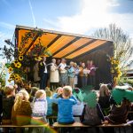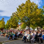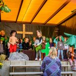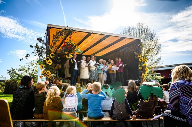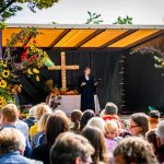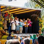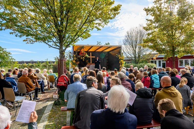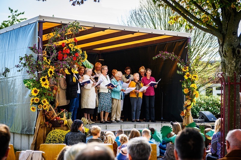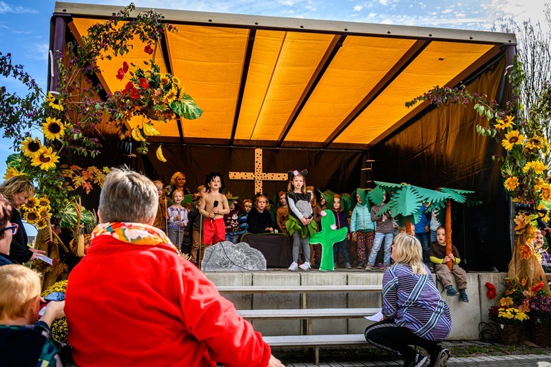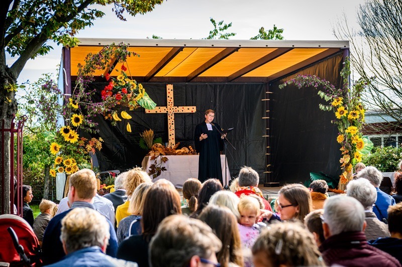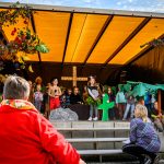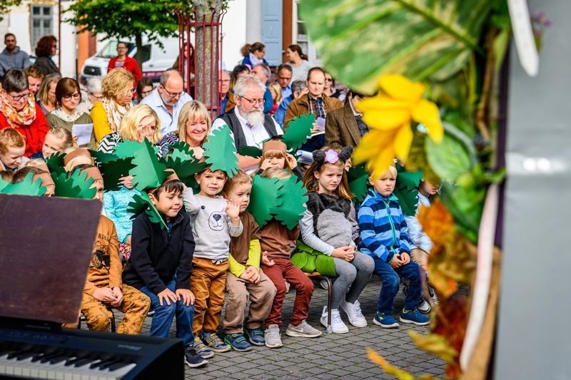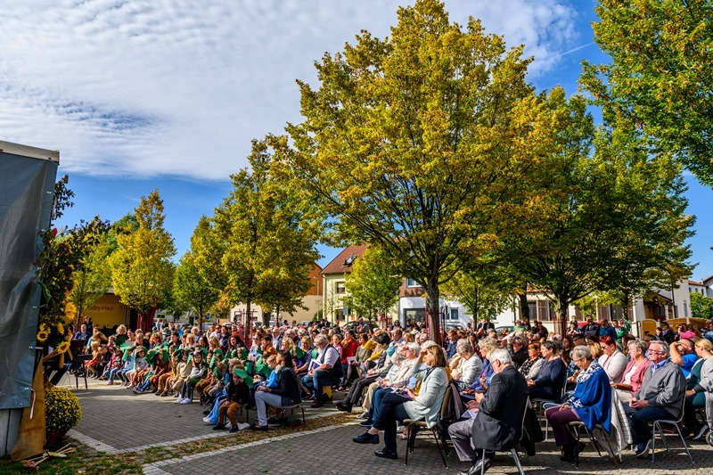 Auf der kleinen Bühne, neben dem großen Kreuz lagen die schön dekorierten und gespendeten Erntedankgaben und stimmten auf den besonderen Gottesdienst der Ev. Kirchengemeinde und das Gemeindefest ein. Umrahmt wurde der Gottesdienst musikalisch vom Musikverein unter der Leitung von Thomas Sturm mit Nessaja aus dem Musical Tabaluga und dem Ohrwurm „Versuchs mal mit Gemütlichkeit“ sowie dem Ev. Kirchenchor unter der Leitung von Hyunju Kwon mit „Lobgesang und unsrer Stimmen Klang“ sowie dem allseits bekannten Lied „Geh aus mein Herz und suche Freud“.