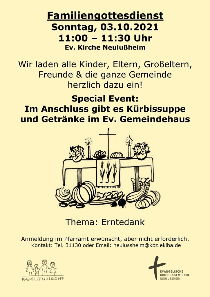 Zum Familiengottesdienst an Erntedank lädt die evangelische Kirchengemeinde Neulußheim am 3. Oktober ab 11 Uhr in die evangelische Kirche. Erntegaben können bis Samstag, 2. Oktober, 13 Uhr, in der Kirche abgegeben werden. Im Anschluss an den Gottesdienst gibt es im Gemeindehaus Kürbissuppe und kalte Getränke. Das traditionelle Gemeindefest, das normalerweise an Erntedank gefeiert wird, wird wegen der Corona-Pandemie ins Frühjahr 2022 verschoben. Eine Anmeldung im Pfarramt ist erwünscht, aber nicht notwendig. Kontakt: Telefon 06205/31130 oder E-Mail an neulussheim@kbz.ekiba.de.