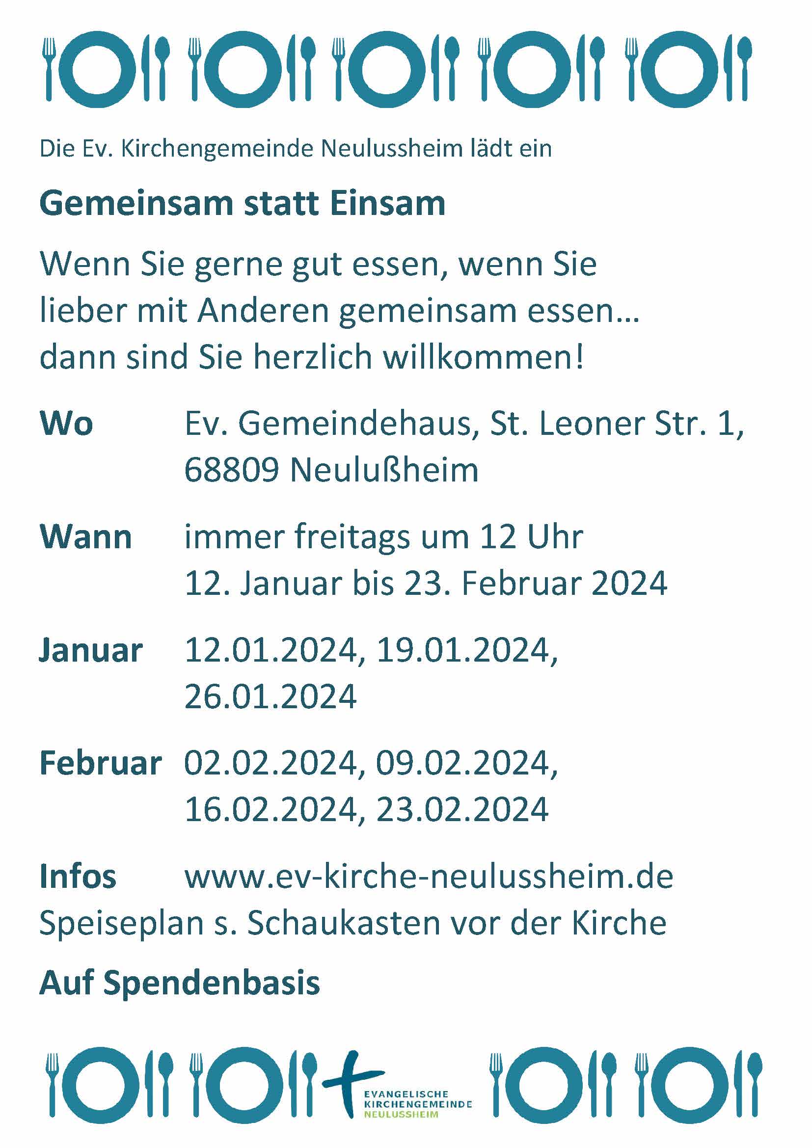Ein bekanntes Sprichwort sagt, dass, wenn es am Schönsten ist, man aufhören sollte. Dem wollten die Gäste aber ungern zustimmen. Seit dem 10.Januar 2020 öffnete die Ev. Kirchengemeinde Neulußheim mit ihrem Projekt „Gemeinsam statt einsam“ für acht Freitage den Gemeindesaal und lud die Bevölkerung ein Platz zu nehmen, ein schmack haftes Essen in Gesellschaft einzunehmen und sich einmal an den gedeckten Tisch zu setzen.