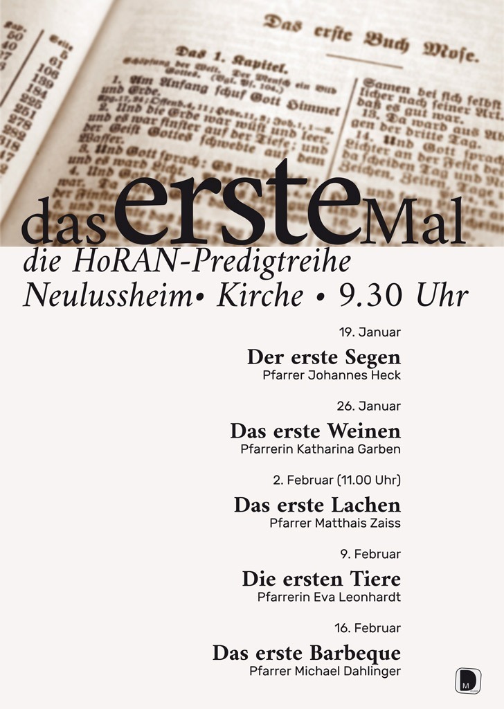 Nicht zum ersten Mal findet an den Sonntagen vom 19.01. bis 16.02. wieder die gewohnte Predigtreihe in der HoRAN-Region statt und die Pfarrerinnen und Pfarrer werden mit ihrer Predigt auf den Kirchenkanzeln in Altlussheim, Hockenheim, Neulussheim und Reilingen munter vom »ersten Mal« predigen.