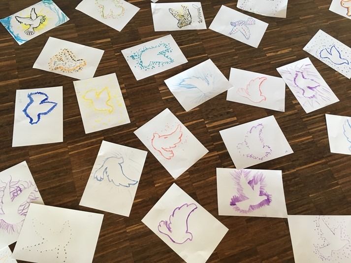 Die Taube gilt als Symbol des heiligen Geistes, und wir haben deshalb mit Punkte-, Tupf- und Wisch-Technik richtig schöne Taubenbilder geschaffen.
