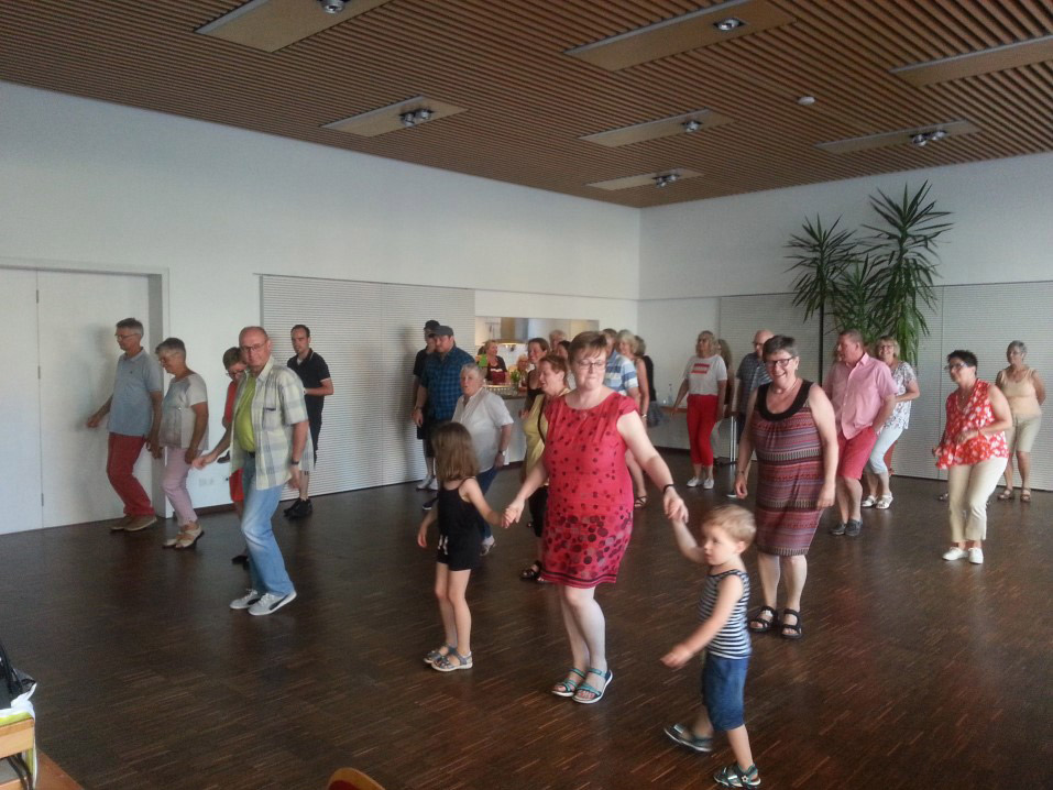 Eine Überraschung bot die Tanzschule Feil. Wolfgang Feil animierte die Gäste, nach dem Essen etwas für die Figur oder die Fitness zu tun und studierte mit ihnen im abgedunkelten Gemeindesaal einen Partytanz ein. Danach sah man so manches Paar professionell über das Parkett schweben. Konfi-Teamer Jannis Bauer legte dazu die passende Partymusik auf und sorgte den ganzen Abend über für leichte Unterhaltungsmusik.