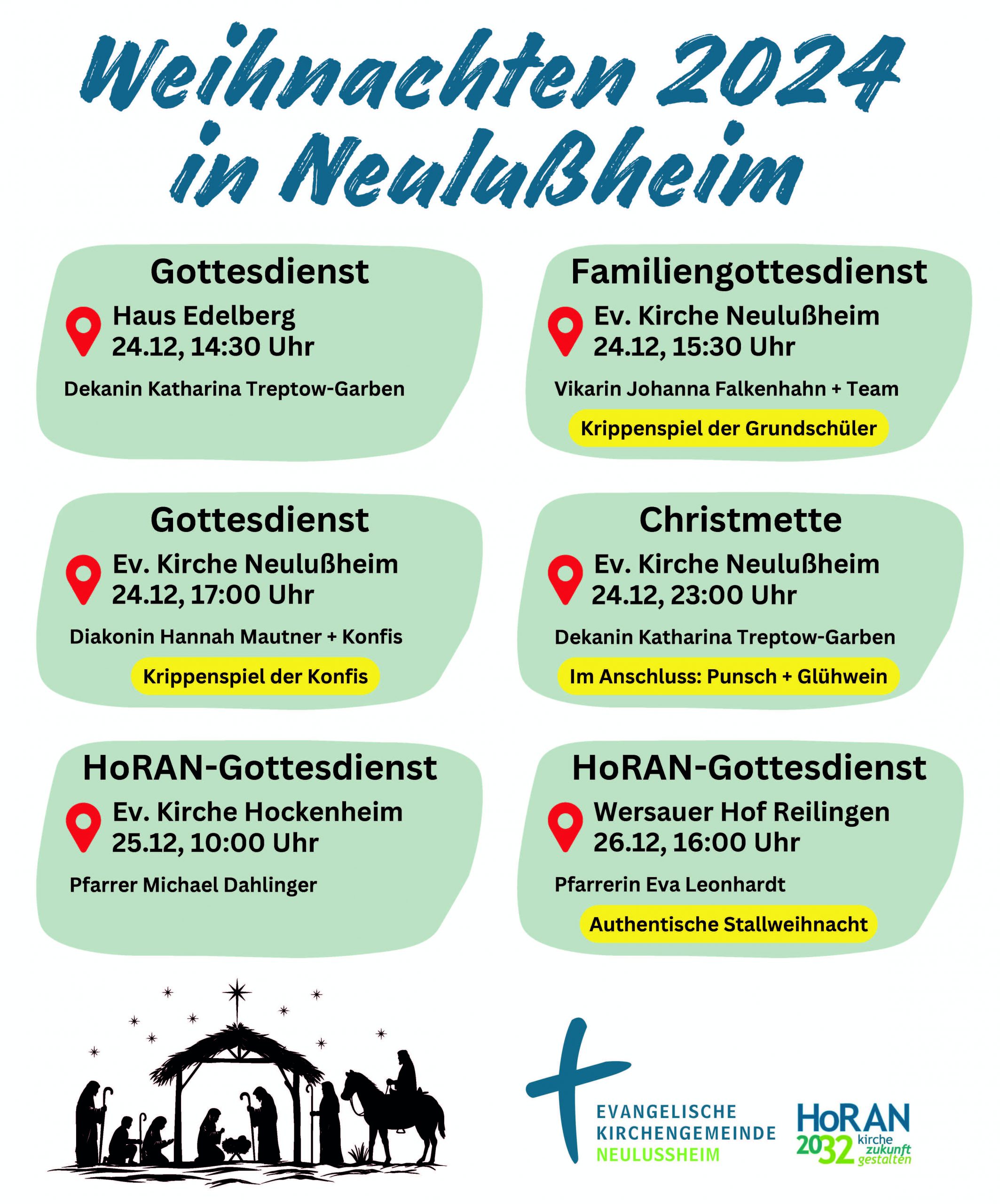 Um 23 Uhr wird die Christmette in der evangelischen Kirche Neulußheim mit Katharina Garben und Joanna Notheis gefeiert. Die Predigt hält Bernd Böttner, Prälat der evangelischen Kirche von Kurhessen-Waldeck. Die musikalische Gestaltung liegt bei Miriam und Klaus Eisenmann, Roland und Karin Haaß, sowie Organist Alexander Levental und einer Abordnung des Kirchenchores. Für diesen besonderen Gottesdienst gilt die 2G-Regel und damit sind deutlich mehr BesucherInnen als sonst zugelassen. Ein entsprechender Nachweis ist mitzubringen.