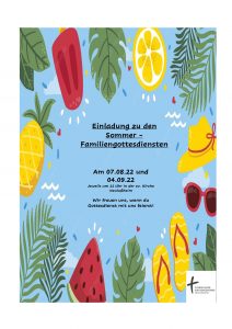 Herzliche Einladung zu den Familiensommergottesdiensten! Am Sonntag werden im Gottesdienst zwei unserer Teamerinnen entsendet in ihre Auslandsaufenthalte und im Anschluss gibt es erfrischendes Eis. Wir freuen uns auf Euch!