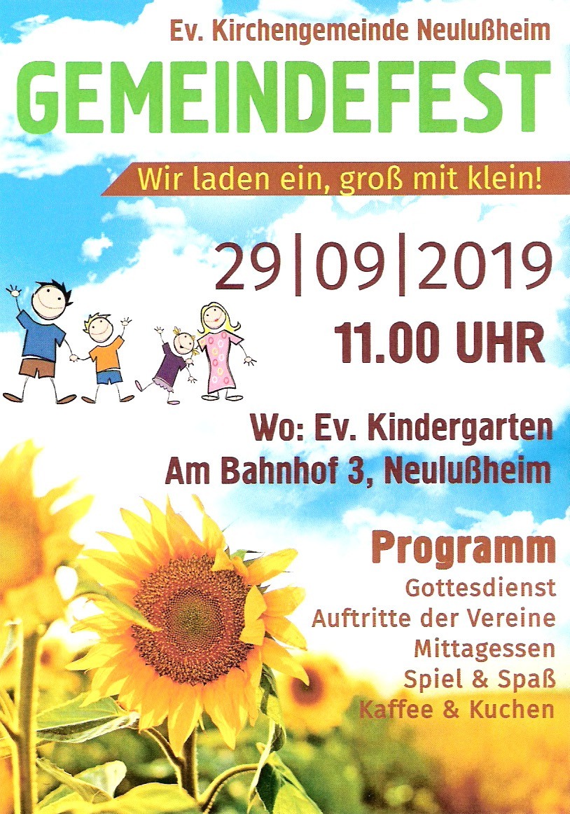 In diesem Jahr feiert die Evangelische Kirchengemeinde ihr Gemeindefest am 29.09.2019 im Evangelischen Kindergarten im Podey Haus. Der Gottesdienst wird um 11:00 Uhr zwischen Altem Bahnhof und Kindergarten stattfinden und wird vom evangelischen Kirchenchor, Organist Gerhard Müller am Piano und dem Musikverein Harmonie Neulußheim mitgestaltet. Im Zentrum des Gottesdienstes steht die biblische Aufforderung „All eure Sorge werft auf ihn“. Die Kinder des Kindergartens werden das mit dem Lied „Probiers mal mit Gemütlichkeit“ auf ihre eigene Art und Weise umsetzen. Ein frisch gekochtes Mittagessen mit verschiedenen Angeboten für Kinder und Erwachsene, Vegetarier und Fleischliebhaber wird direkt nach dem Gottesdienst serviert. Neben Rinderbraten und Knödel gibt es Rotkraut und Pilzsoße, sowie auch Schweinebraten. Für die Kinder (auch für Erwachsene) gibt es außerdem Pommes mit Currywurst zubereitet von Eltern der Kindergartenkinder. Im Anschluss öffnen das Café Morgenlob, die Cocktailbar der Konfis und der Getränkestand des Elternbeirats seine Pforten. Generationenübergreifende Teams können sich in einem Spieleparcours austoben und die Kandidaten und Kandidatinnen für den neuen Kirchengemeinderat werden auf der Garagenbühne vorgestellt. Die Evangelische Jugend sorgt für den richtigen Sound, die Konfi-Teamer-Band spielt und die ein oder andere Vorführung durch die örtlichen Vereine wird stattfinden. Womans Voice, die Jugendfeuerwehr und die Bürgerhilfe Neulußheim werden am Programm mitwirken. Auch ein Kunstprojekt wird es geben, an dem alle Besucher, egal welchen Alters, mitwirken können und sich verewigen. Um 17:00 Uhr wird das Fest mit einem Segen enden. Die Kirchengemeinde freut sich über viele Besucher und über Erntegaben, die am Samstagvormittag, 28.09.2019 im Evangelischen Kindergarten abgegeben werden könne. In diesem Jahr auch Palmblätter und exotische Früchte herzlich willkommen.