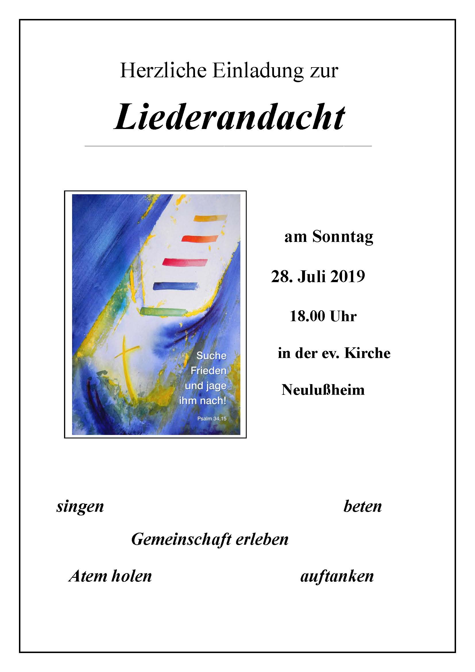 Am Sonntag, dem 27. Januar 2019, findet um 18:00 Uhr in der evangelischen Kirche in Neulußheim eine Liederandacht zum Thema der Jahreslosung statt: