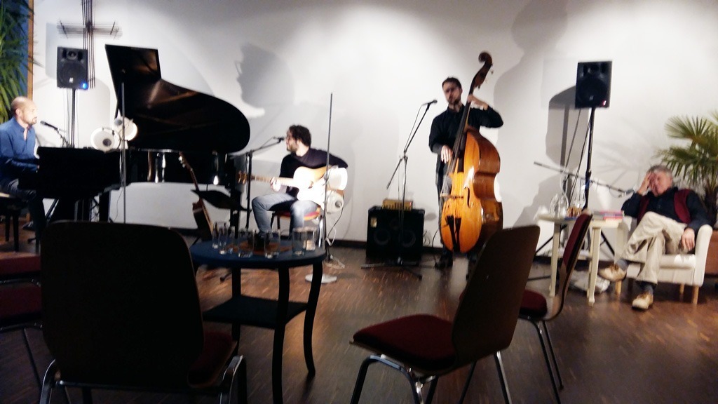 Sohn Christoph, Familienvater, Gymnasiallehrer, Chorleiter, Sänger und Musiker, schreibt seine Lieder und Texte selbst. Christoph Engelsberger am Flügel, begleitet von einem Kontrabassisten und einem Gitarristen ließen beim Publikum auch ohne den an diesem Abend leider erkrankten Schlagzeuger den Eindruck einer harmonischen und vollständigen Band erscheinen.