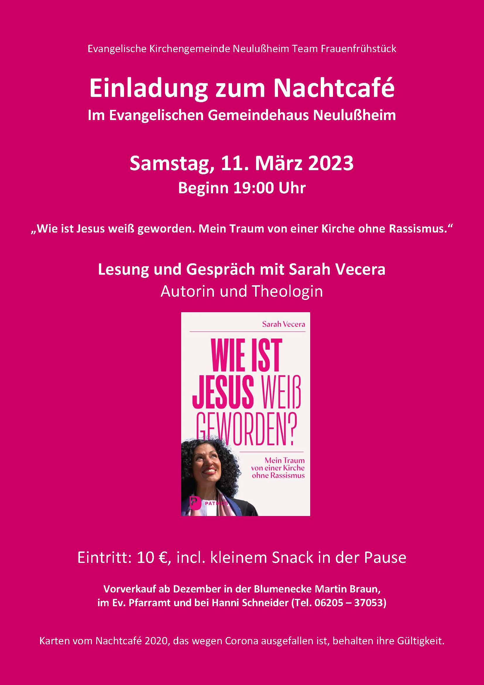 Die Frauengruppe „Morgenlob“ der Evangelische Kirchengemeinde Neulußheim lädt am Samstag, dem 14. März 2020 zum dritten Nachtcafé ins Gemeindehaus ein. Beginn ist um 19.00 Uhr zum Thema „Kirche und Bibel auf Kurpfälzisch“ mit dem bekannten Dozenten, Religionspädagogen und Schriftsteller Michael Landgraf aus Neustadt/Weinstraße.