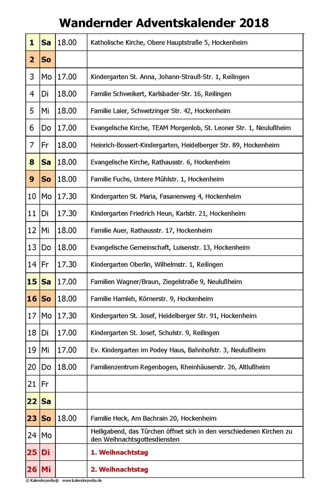 Am 1.12. geht es los um 18:00 Uhr in der Katholischen Kirche, Obere Hauptstraße 5, in Hockenheim.